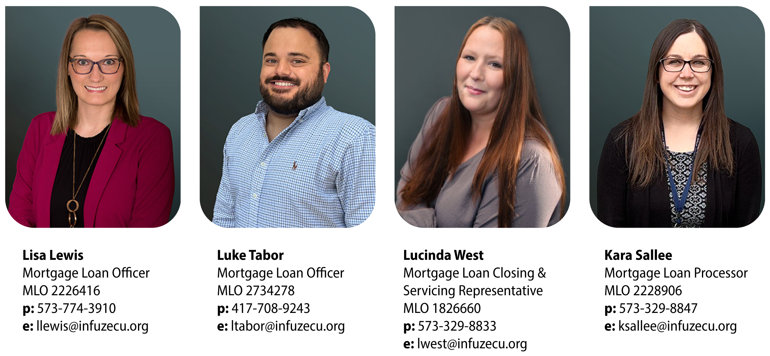 1APR = Annual Percentage Rate. All loans are subject to credit approval and Infuze Credit Union mortgage lending policies. Infuze CU will only consider such loans that would be legal loans as defined by applicable State and Federal regulations. Location of property must be in the state of Missouri. These rate offers are effective 2/24/2026 and subject to change without notice based on market conditions and borrower eligibility. Rates displayed are the "as low as" rates for purchase loans and refinances. Rates are based on creditworthiness, loan-to-value (LTV), occupancy, and loan purpose, so your rate and terms may differ. Property insurance is, and flood insurance may be, required. Applicant(s) must be a member in good standing or be eligible for membership. Some restrictions may apply. See credit union for details.